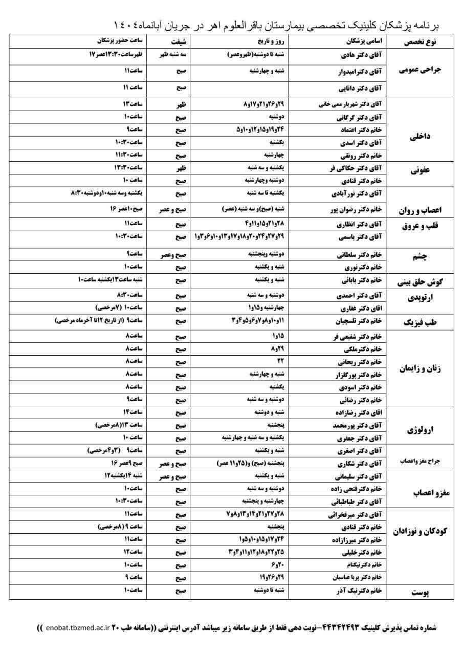 برنامه پزشکان کلینیک تخصصی بیمارستان باقرالعلوم